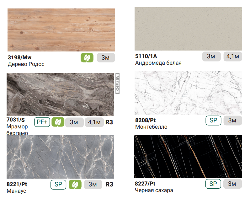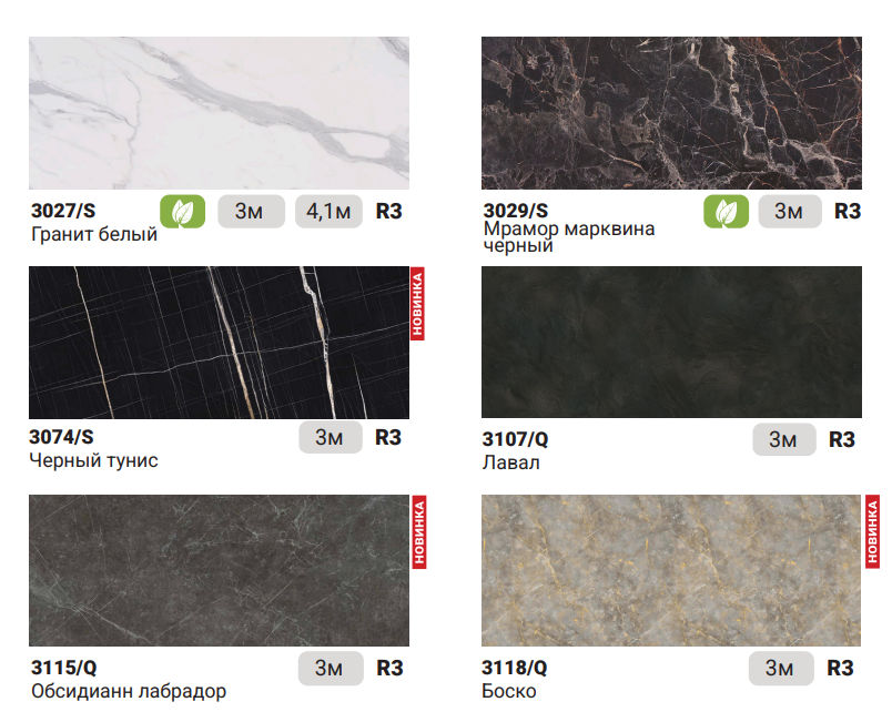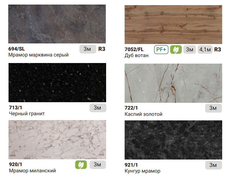 Ассортимент. Постоянно пополняющийся ассортимент декоров позволит найти интересные решения для интерьеров с самыми высокими требованиями. В нашей складской программе есть все – от вечной классики до современных недорогих имитаций древесины и каменных пород.